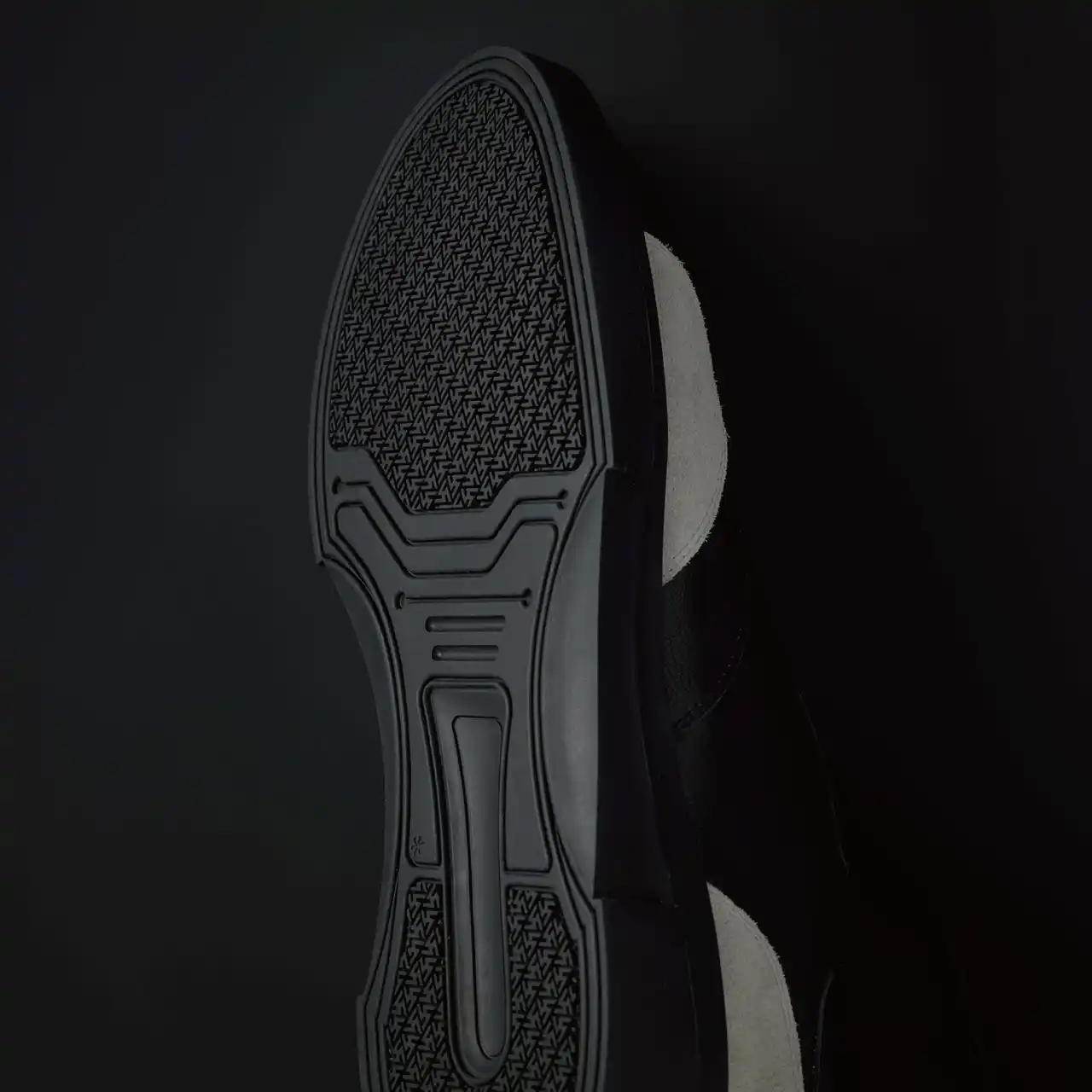 本来は革靴内部に搭載され、変形防止や耐久性向上、歩行時の安定性を支えるシャンク構造を、スニーカーのソールで再現。ソール中央に一本の芯を通すことで、着用時のねじれや歪みを抑え、美しいフォルムの維持に貢献している。 |