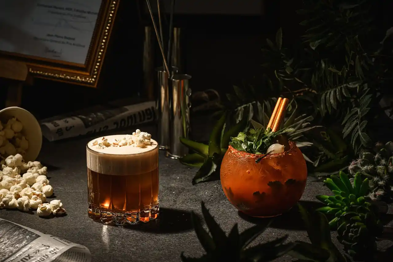ポップコーン香るバーボンにキャラメル、ビターズ、コーラムースを重ねた、映画館気分の |