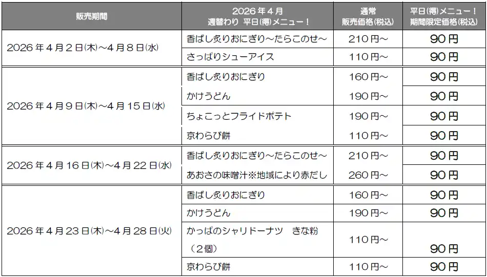 | 4月も毎日かっぱ寿司! おにぎり、うどん、ポテト、味噌汁、デザートなど、人気メニューが週替わりで、税込各90円!平日限定! 2026年4月2日(木)~4月28日(火)予定、かっぱ寿司全店で |