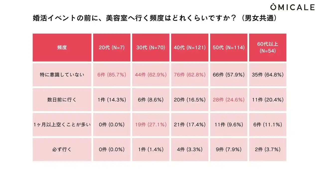 〇婚活前に美容院へ…は特に意識されず。 婚活前に美容院に行くか、という問いに対し、全年代で「特に意識していない」が過半数(57.9%~85.7%)を占めており、イベント前の準備のために美容室を利用することまでは意識していない人が多数派です。 イベントの「数日前に行く」という意識的な準備は、50代(24.6%)が最も高く、中高年層の方がイベントに合わせて身だしなみを整える傾向が強いことがわかります。 |