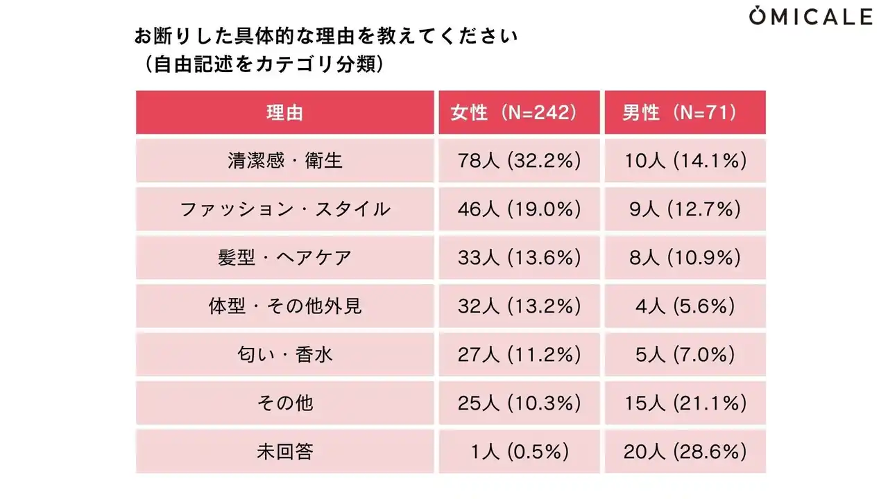 なお、お断りした理由について自由記述での回答を募ったところ、「カバンが古びていた」、「洋服が古い」「髪がぼさぼさ」…など、リアルな声が多数寄せられました。 「金髪が苦手」や「自分好みの洋服ではない」など、趣味嗜好があわないケースもあり、やはり実際お会いしてみないとお相手との相性は図れないといえます。 |