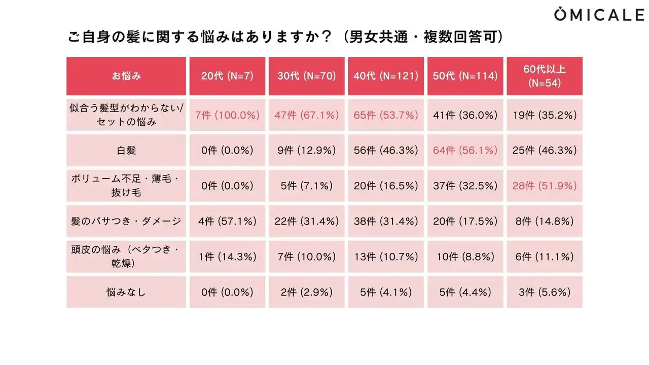 | 〇自分の悩みは年代とともに変化。「髪型迷子」から「白髪」へシフト | |||||