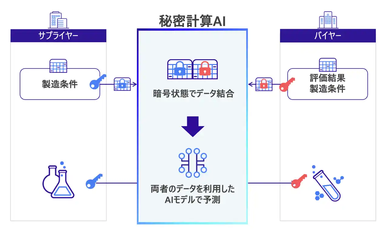 | 近年、マテリアルズ・インフォマティクス(以下、「MI」)を用いた研究開発が加速する中、さらなる高度化には企業同士の連携が鍵となります。本実証では、EAGLYSが保持する秘密計算技術を活用し、日立ハイテクのMI技術を用いて巴川コーポレーションと連携し、企業間における機密情報を保持したまま製造条件の最適化を目指します。 | |||