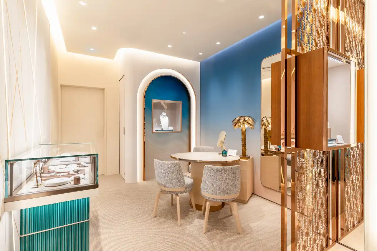 この新しいブティックは、日本の店舗の中で最も多くのフランス人職人による仕上げと素材が使用される初めての店舗となります。カウンターの土台にあしらわれたセラミック、アーチに組み込まれたブルーのグラデーションの壁紙、そしてフレッドとフランス人アーティストによってデザインされたロープパネルなど、これらすべてがメゾンのために特別に作られたものであり、本物の職人技を象徴しています。より快適で没入感のある体験を提供するこの居心地の良い空間は、南仏の輝く光を思わせる、暖かく日当たりの良い雰囲気でお客様をお迎えします。 |