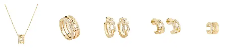 新作 フォース10 ライズ イエローゴールド x ダイヤモンド:ネックレス:731,500円、リング:999,900円、イヤリング ラージモデル:1,980,000円 イヤリング スモールモデル:984,500円、イヤーカフ:360,800円 |