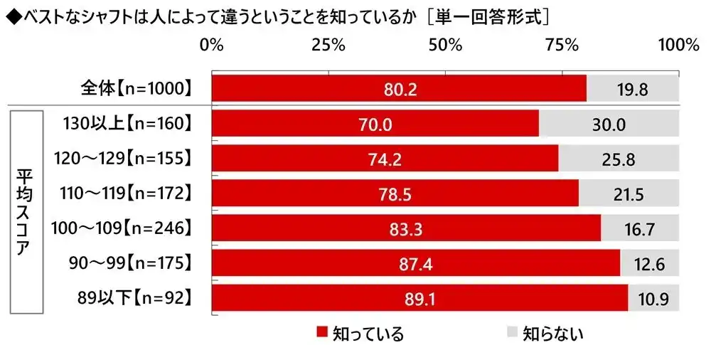 全回答者(1,000名)に、ベストなシャフトは人によって違うということを知っているか聞いたところ、「知っている」は80.2%となりました。どのようなシャフトが適しているかは一人ひとり異なっています。シャフトを選ぶ際はその人に合うものを選ぶことが大切だと考えている人が多いのではないでしょうか。 |