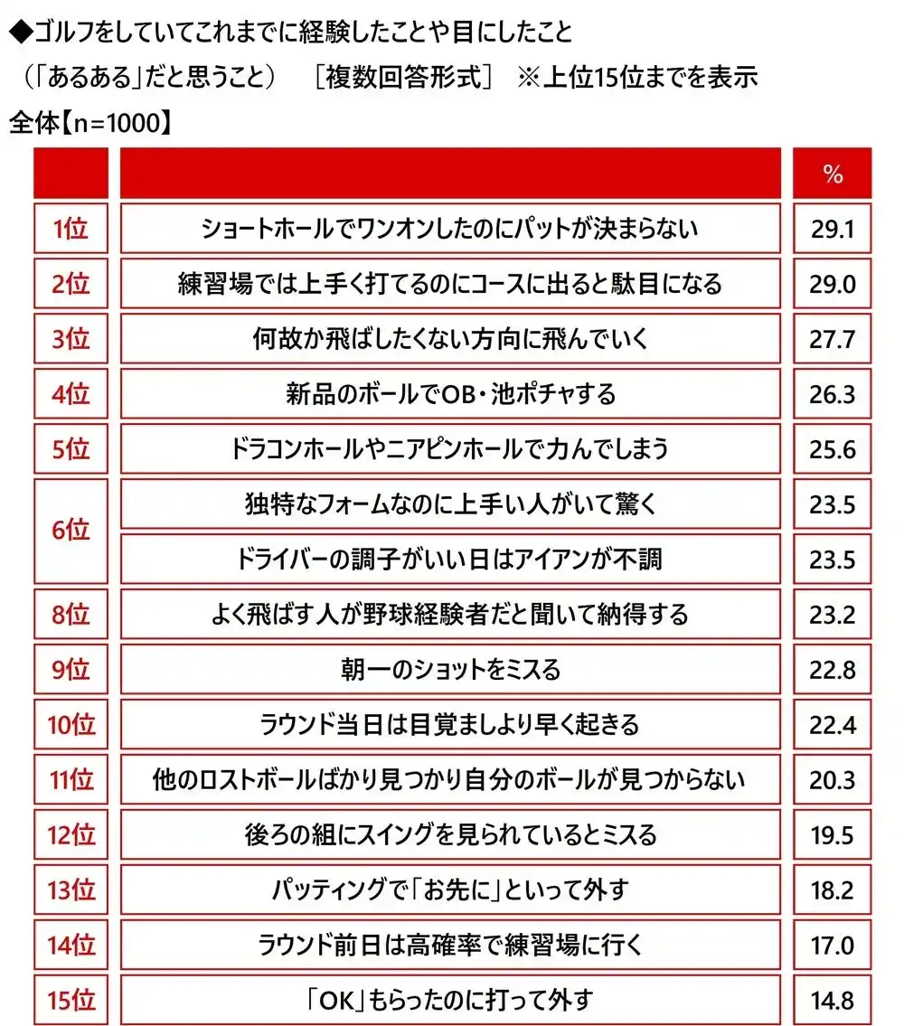 そのほか、「ドライバーの調子がいい日はアイアンが不調」(23.5%)や「他のロストボールばかり見つかり自分のボールが見つからない」(20.3%)、「パッティングで『お先に』といって外す」(18.2%)、「『OK』もらったのに打って外す」(14.8%)といった、思ったようにならない“あるある”もみられました。 |