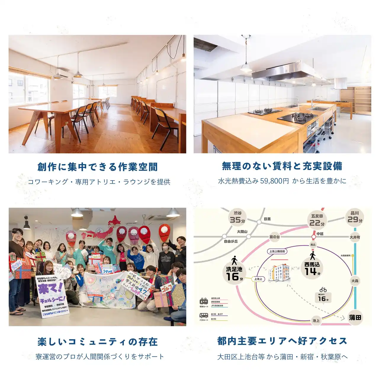 上池台トキワソウルームは、23区内・地下鉄線沿いでありながら、1室あたり管理費込みの月額賃料で59,800円(ベーシックプラン、水光熱費ネット代込み)というアフォーダブルな住まいを実現しました。 |