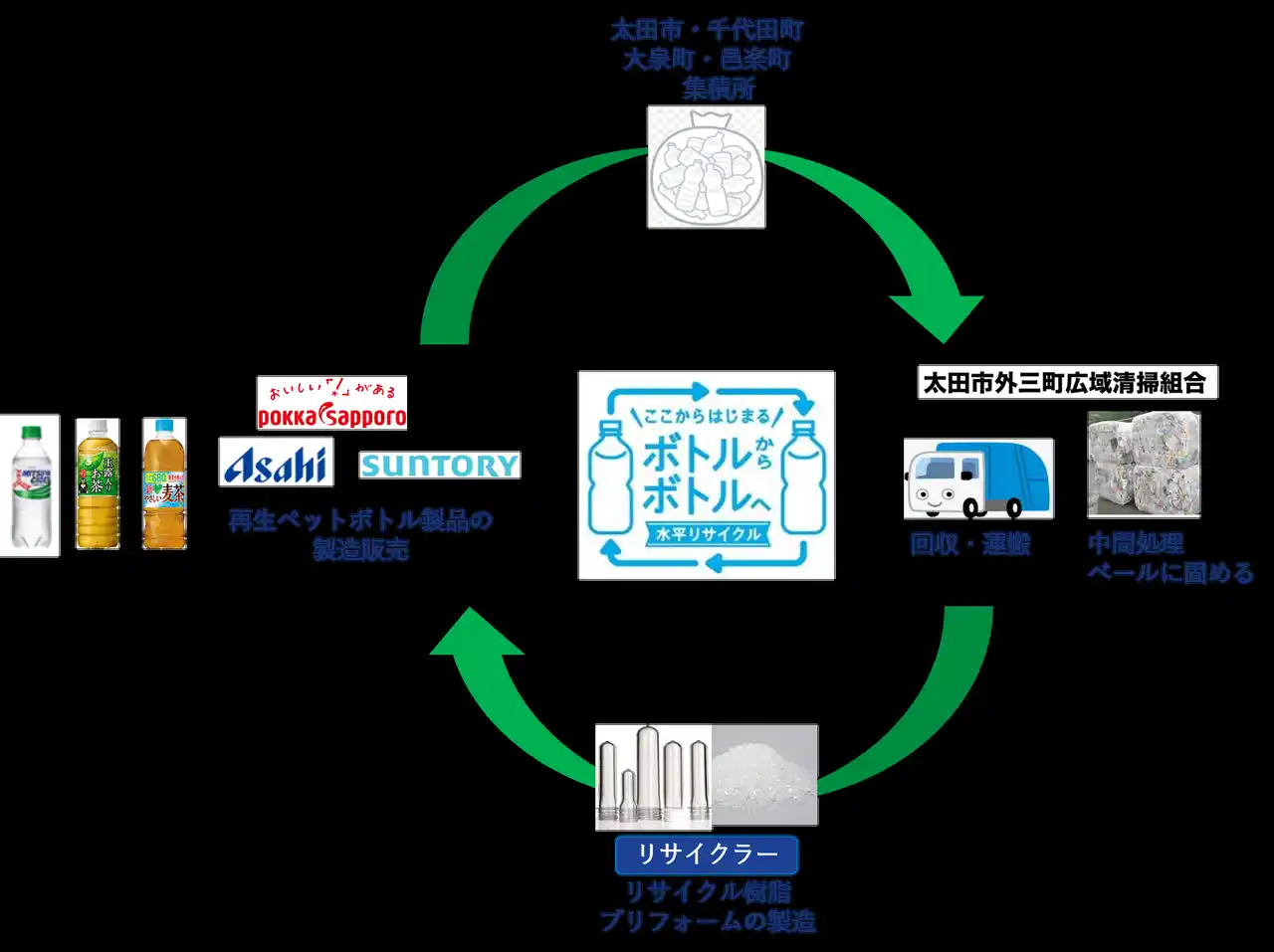 本協定に基づき太田市外三町広域清掃組合と各社は協働で、4つの自治体の家庭から回収された使用済みペットボトルを新たなペットボトルに再生して飲料容器として再利用する「ボトルtoボトル」事業を2026年4月から開始します。また住民や事業者を対象に、ペットボトルの水平リサイクルに関する普及啓発活動も実施します。 |