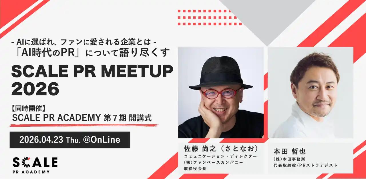 また、開講式当日は、グリーティングイベントとなる「SCALE PR MEETUP」を同時開催。Keynote Sessionに『AIに選ばれ、ファンに愛される。~変わる生活者とこれからのマーケティング~』著者の佐藤尚之(さとなお)氏を迎え、「AIに選ばれ、ファンに愛される企業とは。AI時代のPR」をテーマに、SCALE Founder/PR ACADEMY学長である本田哲也と徹底討論いたします。
