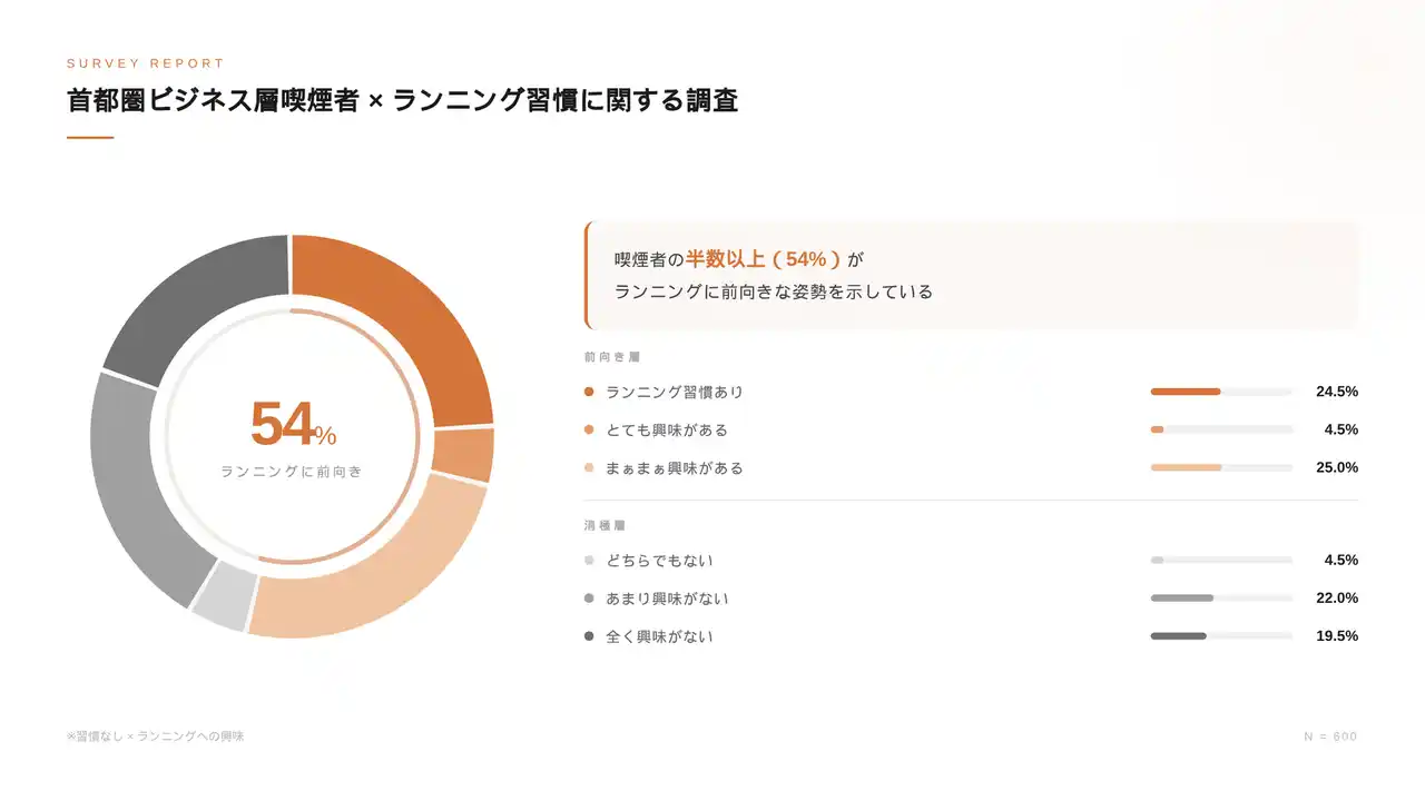 | 首都圏の喫煙者の24.5%はランニング習慣を持ち、さらに29.5%は未実践層ながらランニングに関心を示していることから、半数以上の喫煙者がランニングに前向きであることが明らかになり、喫煙者の中にも“運動志向の層”や“潜在的な実践予備軍”が一定数存在することが分かります。(※1) | |||||||||||||||||||||||