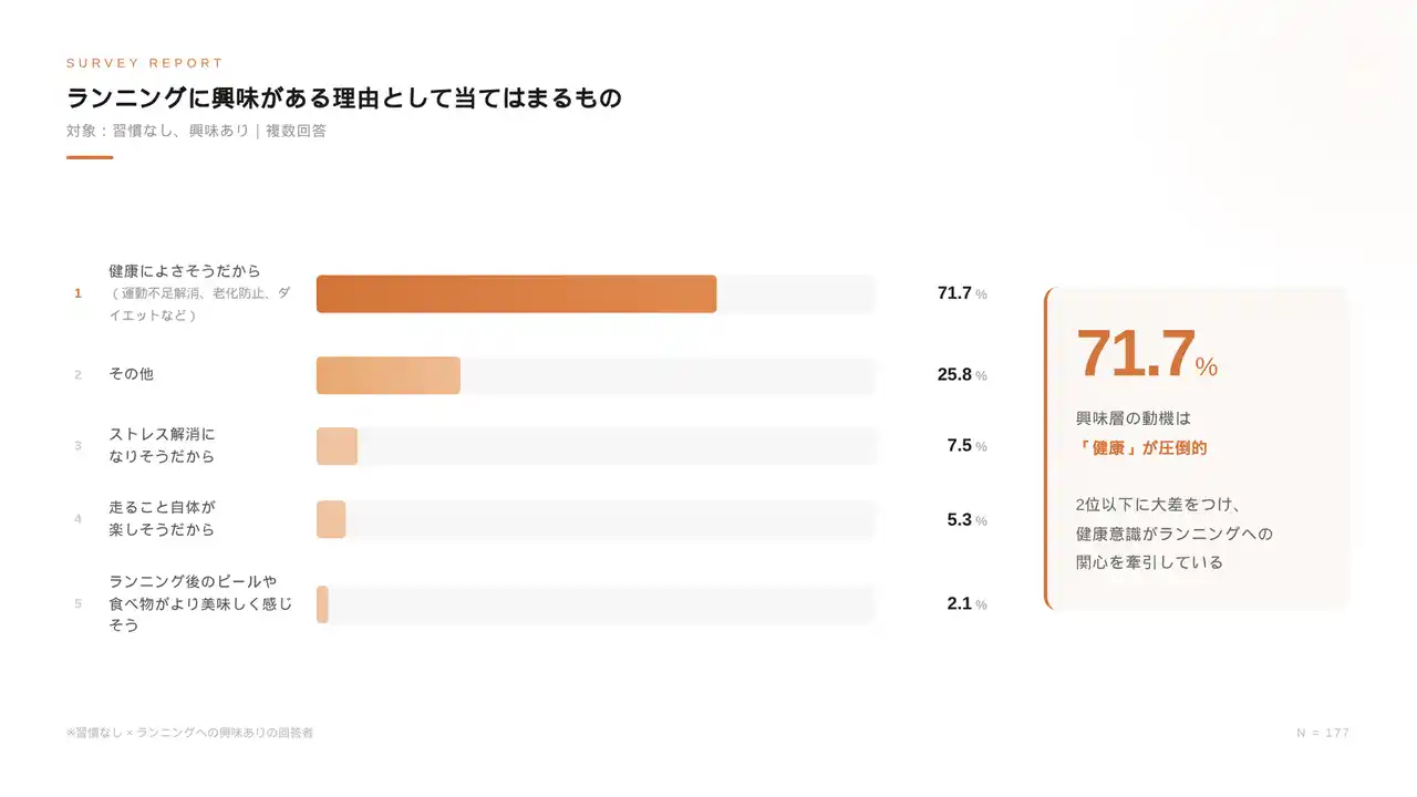 | また、ランニングに興味がある理由として「健康に良さそうだから」という回答が約72%を占めており、喫煙者には健康や自己管理に対して前向きな関心を持つ層が一定数存在しています。こうした結果から、都心にある喫煙所は健康をテーマとした情報や行動変容を促すコミュニケーションを受け入れやすい空間特性を有していると考えられます。(※2) | |||||||||||||||||||||||