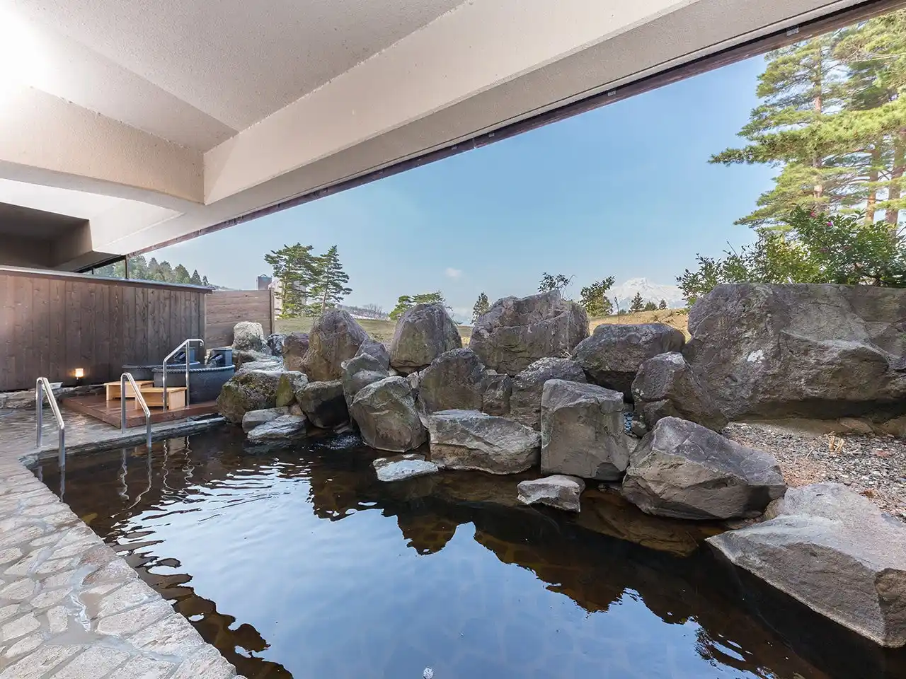 温泉露天風呂とサウナも完備の大浴場。雄大な妙高山を望みながら極楽のひと時を |
