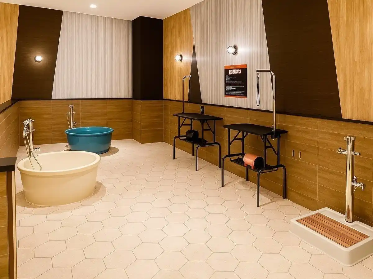 【 宿泊者利用 】 無料 (チェックイン日からチェックアウト日まで何度でも利用可能) 【一般(外来)利用】 有料(通常価格1頭1,000円税込) オープン記念価格で6月末まで1頭500円で利用可能! ※屋外ドックランは無料で利用できます。 |