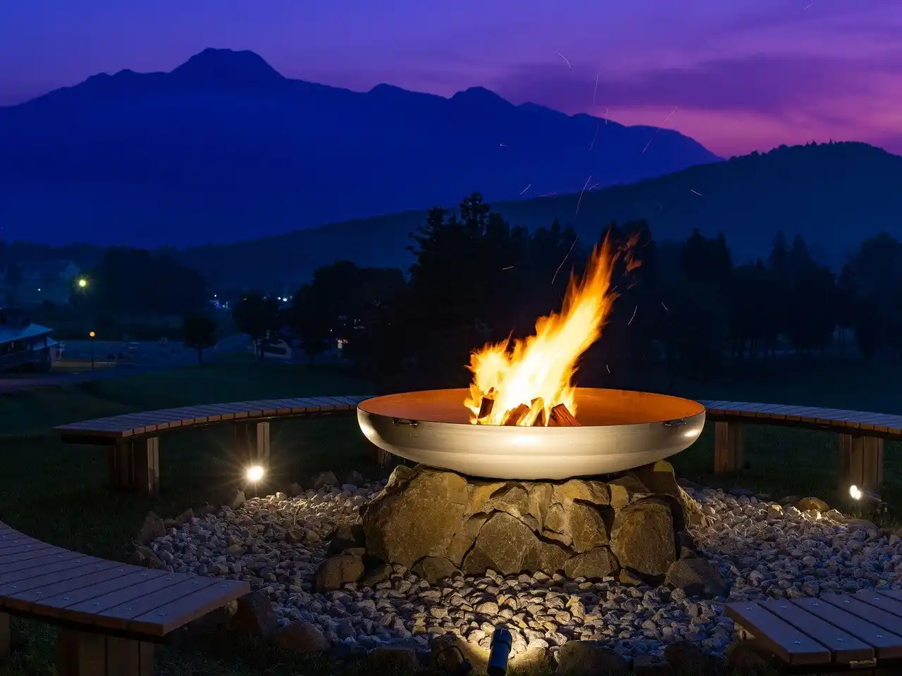 妙高連峰が見渡せる眺望豊かなエリアに焚火を設置。焚火を囲みながら大自然を体感 |