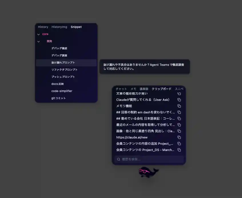 | クリップボードの履歴を1000件以上も永続的に自動保存(テキスト最大1000件、画像最大30枚)。複数のコピーを連続で積み上げて順番にペーストできるため、繰り返しのコピペ作業が一気に高速化します。よく使うフレーズのスニペット登録に対応。複数のコピーを連続で積み上げてから順番にペーストする「スタックペースト」も可能です。よく使うプロンプトなどをセットしておくと、とても便利です。 | |||||||||||||||