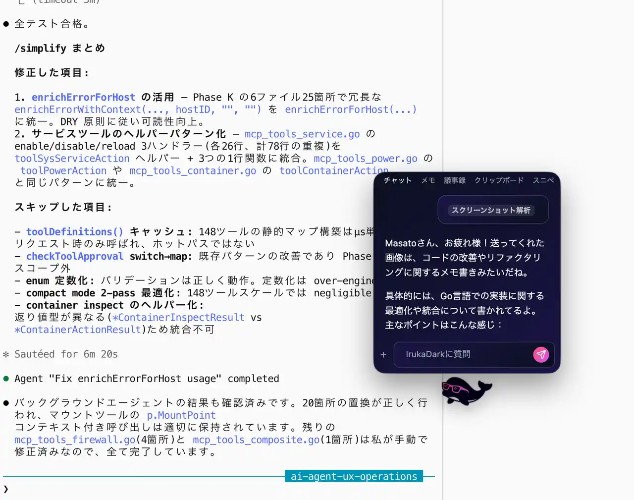 | IrukaDarkは、あなたのPCで同じ画面を見ている「賢いペット」のようなデスクトップ常駐型AIです。 Webサイトの記事、難解な技術ドキュメント、開発環境、SaaSのダッシュボード、PDF資料、オンライ会議している相手の投影資料まで。IrukaDarkを使えば、日々の業務で「わからない」に出会ったとき、わざわざテキストをコピーし、プロンプトを入力したり、別のタブに切り替えたりする必要もありません。ブラウザを開いてAIに質問しに行く手間がなくなります。 | |||||||||||||||
