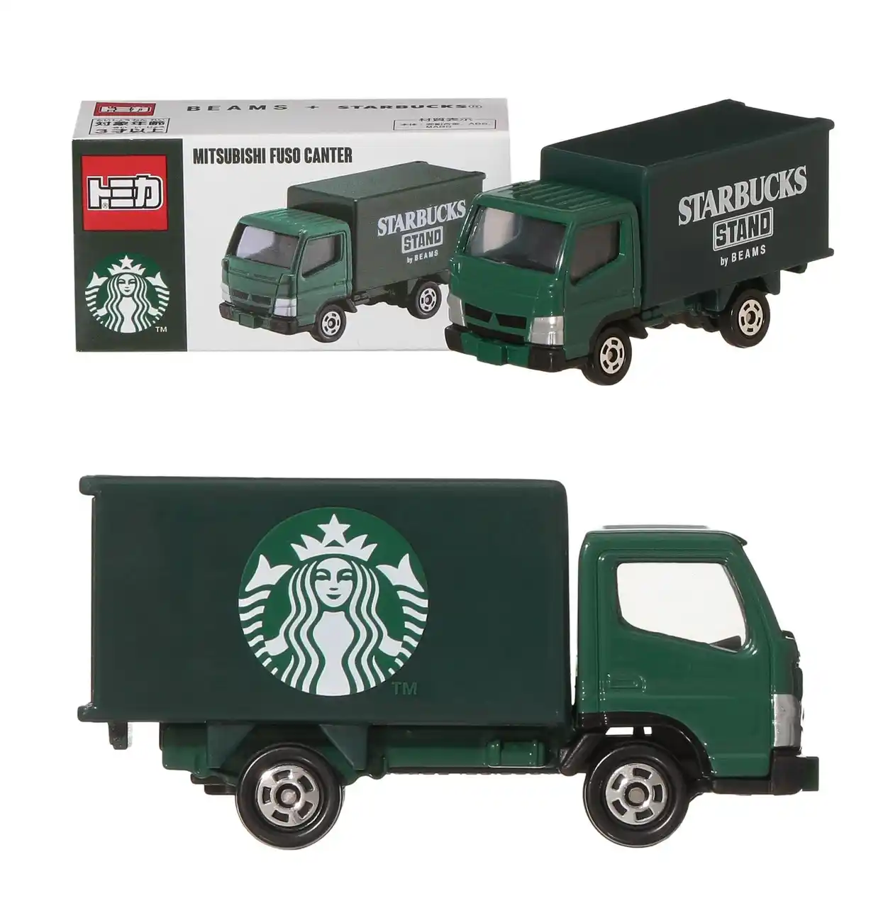 ビームスの物流トラック(ビームス号)でも実際に使用されている車種のひとつ「三菱ふそう キャンター」を全面グリーンに変更。荷台の左右の側面にそれぞれ〈STARBUCKS STAND by BEAMS〉ロゴとサイレンロゴをあしらった別注限定のデザインを施しています。BEAMSらしさとSTARBUCKSらしさが感じられる、〈STARBUCKS STAND by BEAMS〉のコンセプトを体現したアイテムです。 |