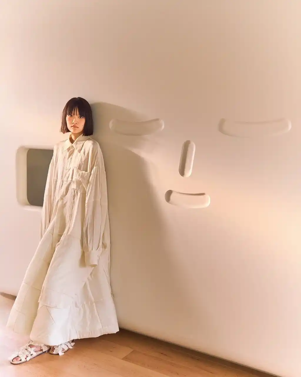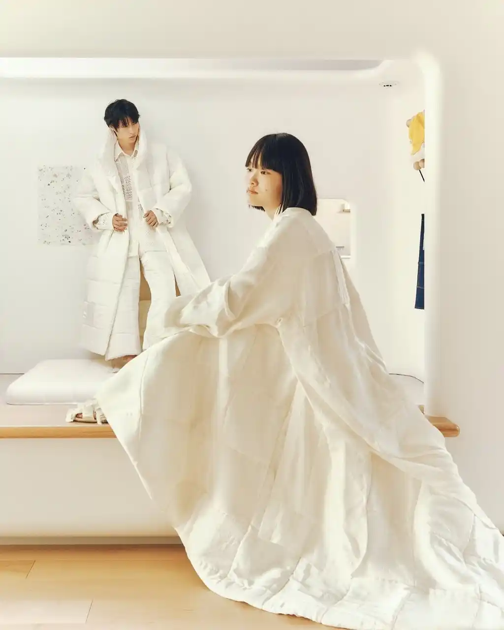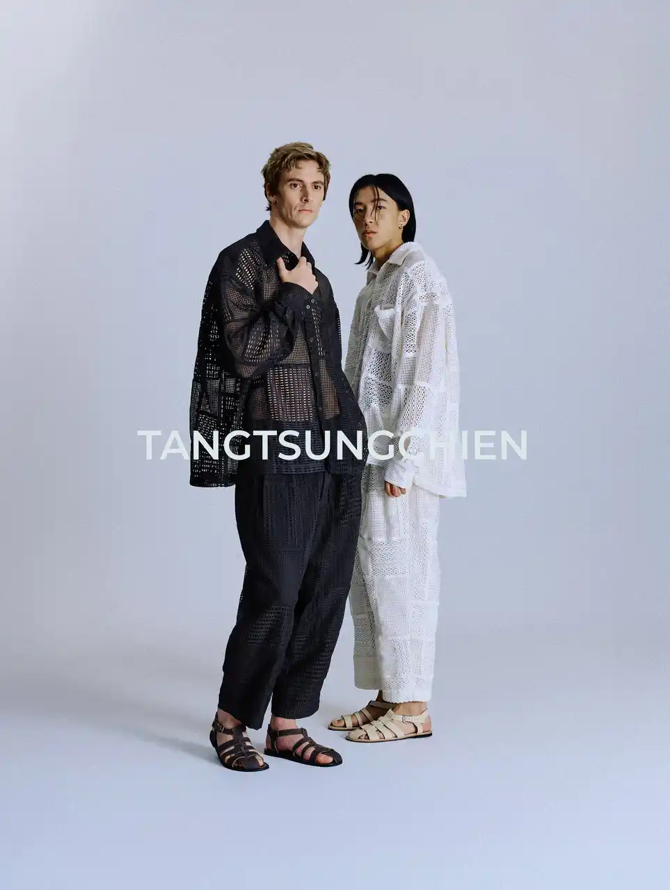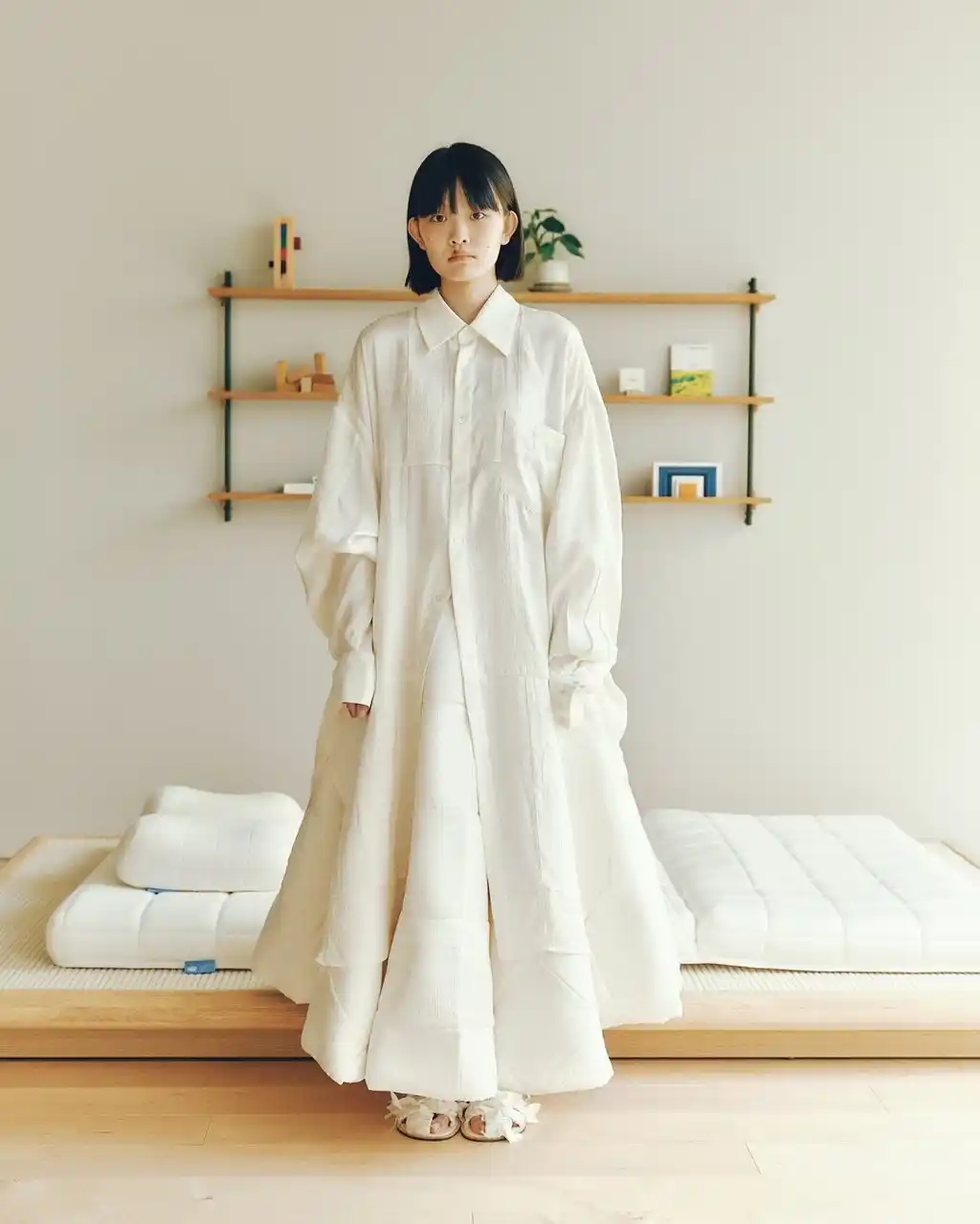 SLEEPY TOFUの象徴的な生地を使用し、TANG TSUNG CHIENブランドの象徴的な異素材パッチワークと融合。トーンはオフホワイトとアイボリーを基調とし、清らかで安心感のある雰囲気を演出しています。 ロングコートは、格子構造を立体的な支えとして再現し、体を託し、ぬくもりで包み込む保護レイヤーを形成。 |
