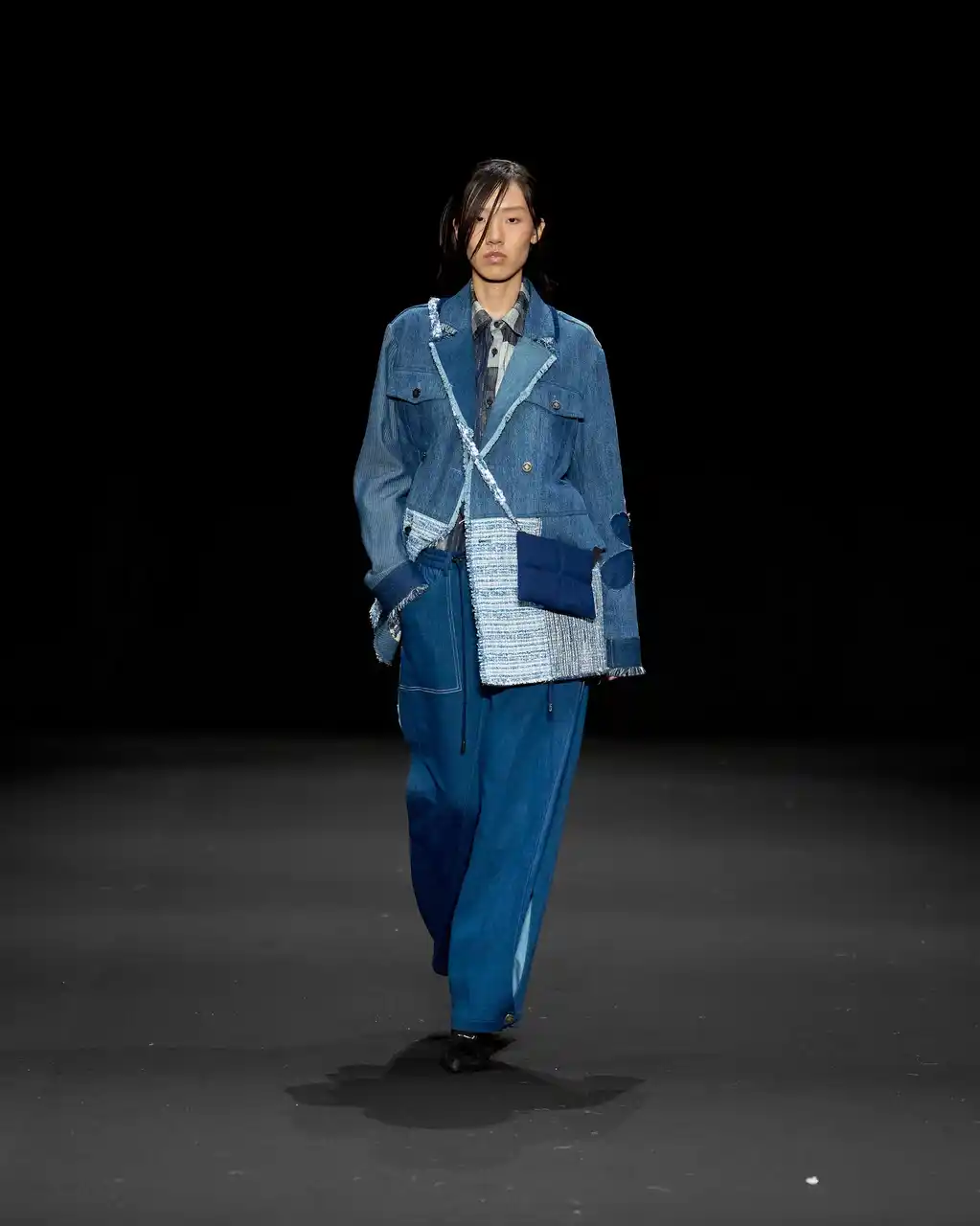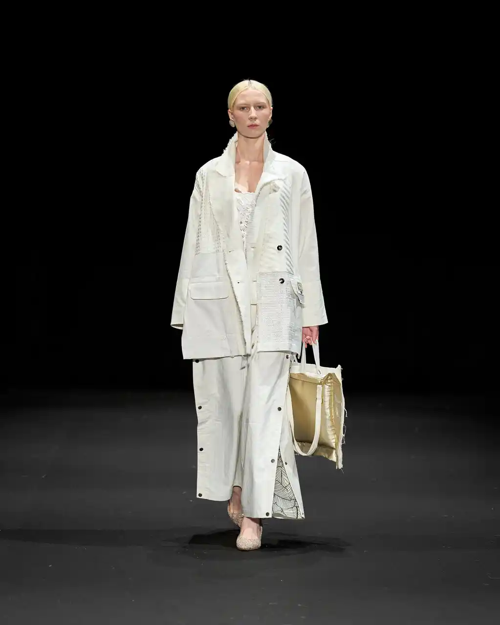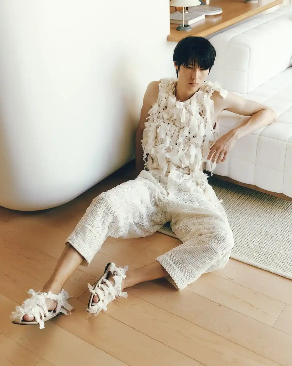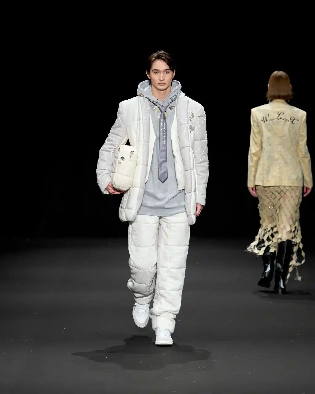 SLEEPY TOFUの象徴的な生地を使用し、TANG TSUNG CHIENブランドの象徴的な異素材パッチワークと融合。トーンはオフホワイトとアイボリーを基調とし、清らかで安心感のある雰囲気を演出しています。 ロングコートは、格子構造を立体的な支えとして再現し、体を託し、ぬくもりで包み込む保護レイヤーを形成。 |