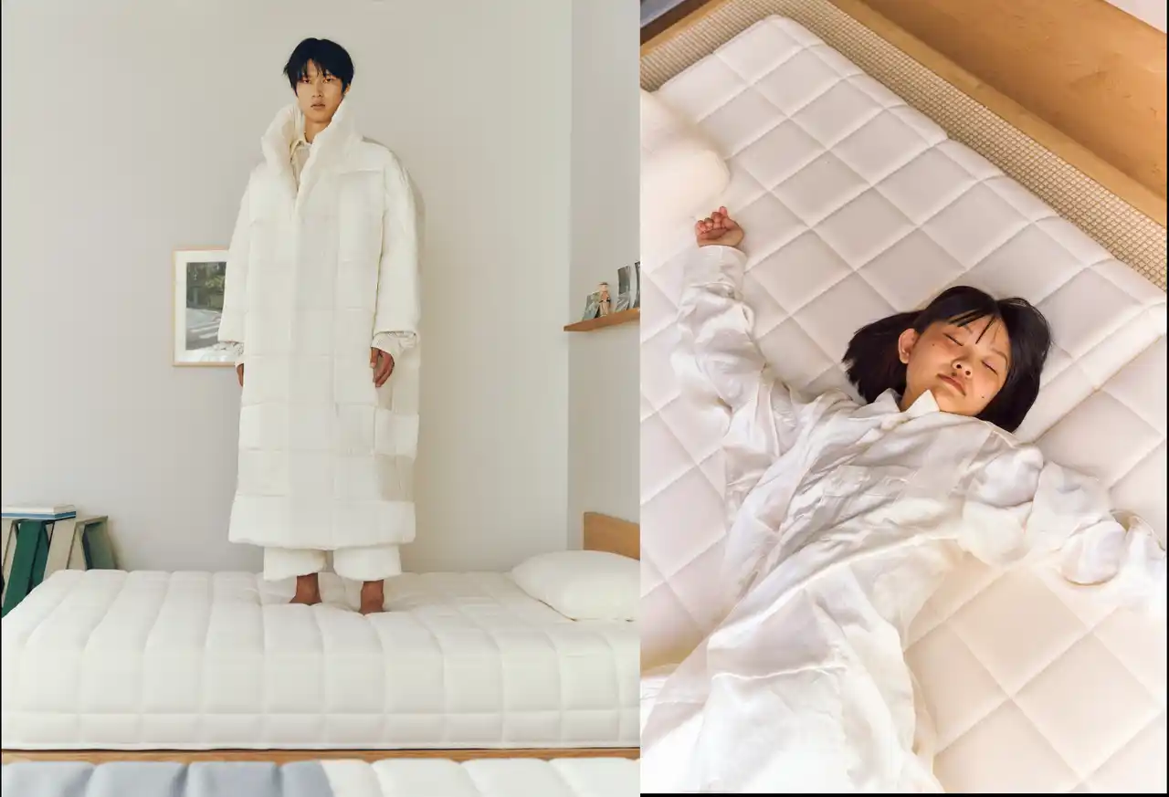 今回発表した3ブランドとのアパレルコレクションには「暮らしをやわらかくする」というブランド理念を踏襲しています。デザインの着想源となったのは SLEEPY TOFU の象徴である“豆腐の格子”。「支えることと包み込むこと」「秩序と自由」のバランスを象徴しており、そのまま衣服のデザインに落とし込みました。 |