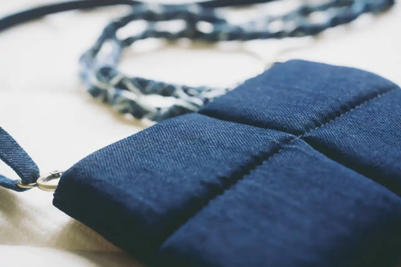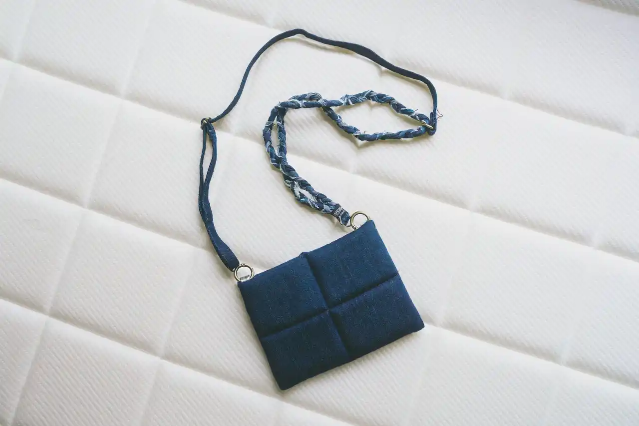 スリーピー・とうふマットレスの格子状デザインを着想源に、回収されたデニムをパッチワークで仕立て、柔らかさと適度なボリューム感を備えた手触りに仕上げました。マットレス端材のメモリーフォームによる格子状のクッション構造を、手編みでショルダーストラップに落とし込み、長さ調節が可能です。現代的なファッションアイテムに馴染み、スマートフォンやクレジットカードを収納可能。ストラップは取り外し可能で、単体ではスマホストラップとしても使用できます。 |