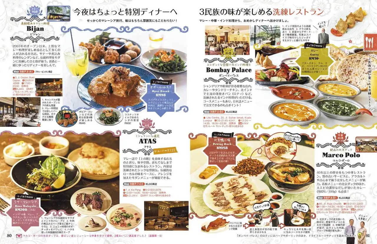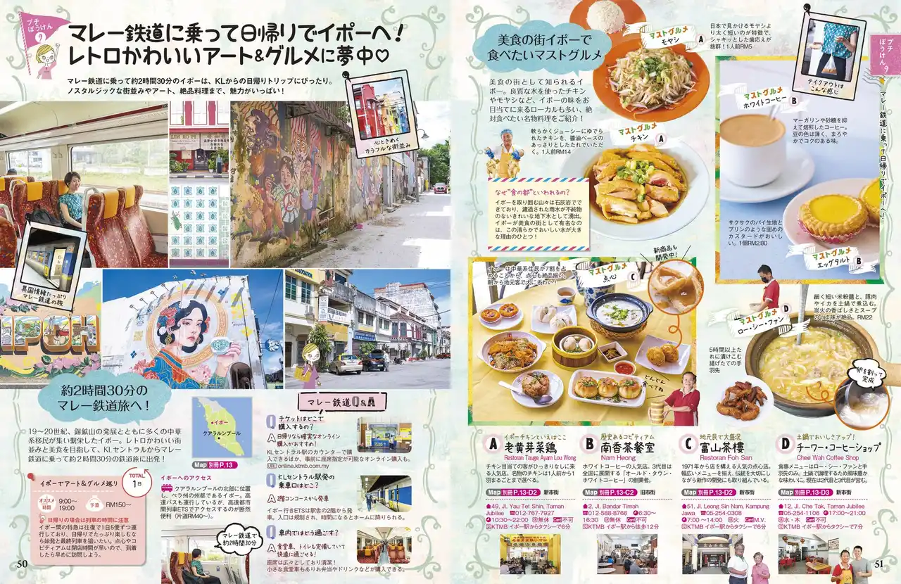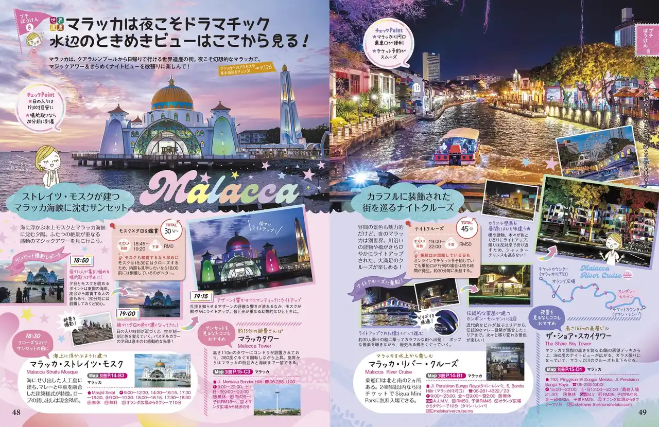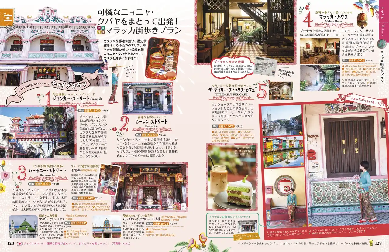 | 世界遺産の街マラッカでは、カラフルな建物や歴史ある教会、異国情緒あふれる街並みの散策が楽しめます。伝統のニョニャ料理や地元で愛される名物食堂、プラナカンの世界を堪能できる博物館などマラッカならではの魅力を10ページ以上にわたってたっぷりご紹介します。 | |||||||