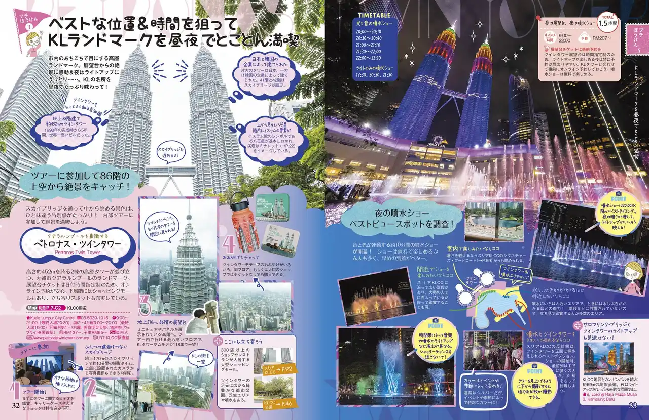 ・マイヒジャブをまとって 個性派モスクの美建築にうっとり ・マレー×中華×インド×ニョニャ KL4大グルメを1日で制覇 ・KLランドマークの昼夜ベストビュースポットを満喫 ・チャイナタウンでカラフルフォトさんぽ ・マレー鉄道に乗ってイポーへ日帰りトリップ ・キャメロンハイランドで心身リチャージ ・セランゴールのスカイミラー&蛍に感動 ほか |