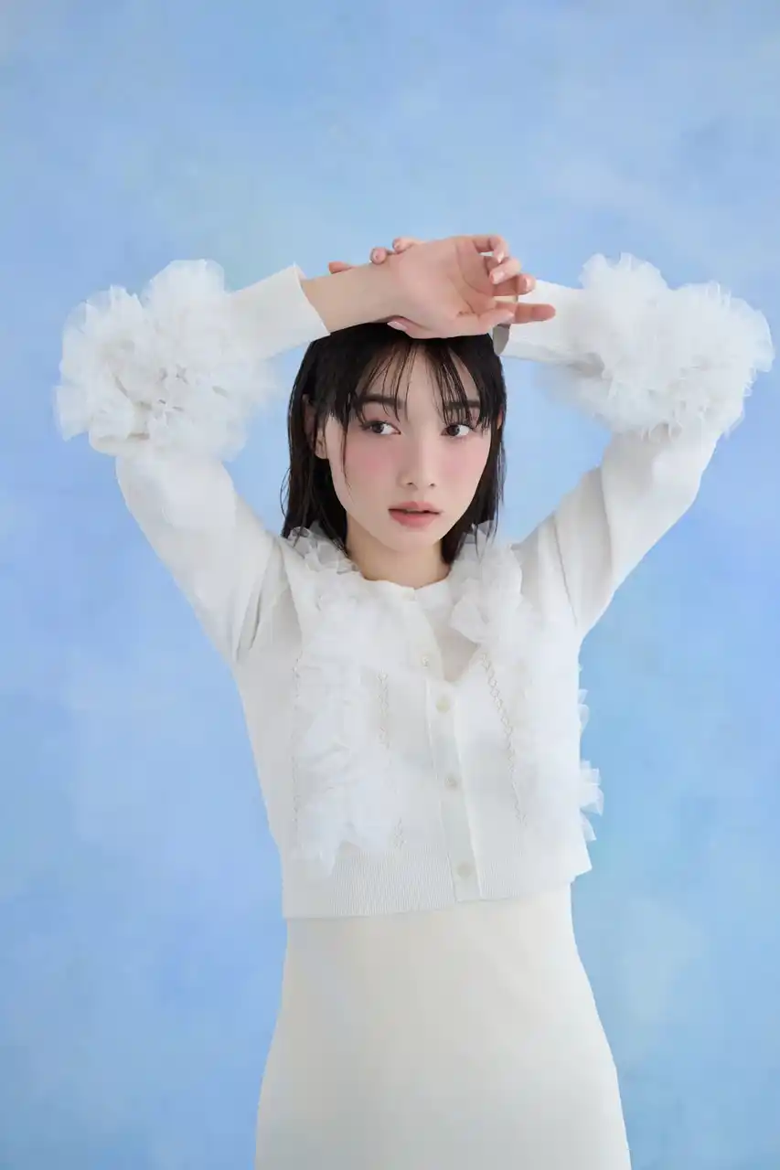 UVカット機能素材を採用し、フロントと袖にチュールフリルをあしらった華やかさと機能性を兼ね備えたカーディガン。 |