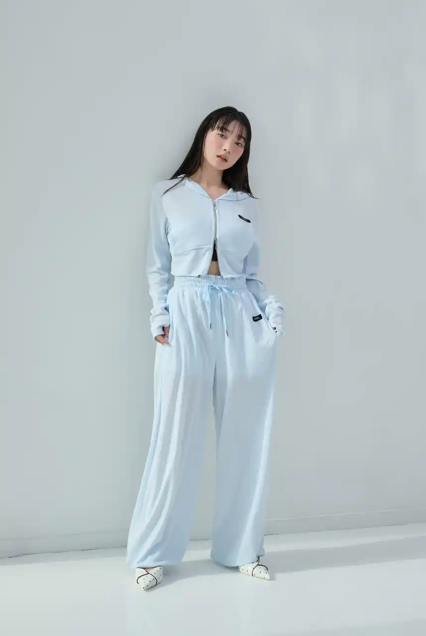 パーカーと同素材のカットソーパンツは、太幅のウエストベルトにギャザーをたっぷりと入れてフェミニンな印象に。 |