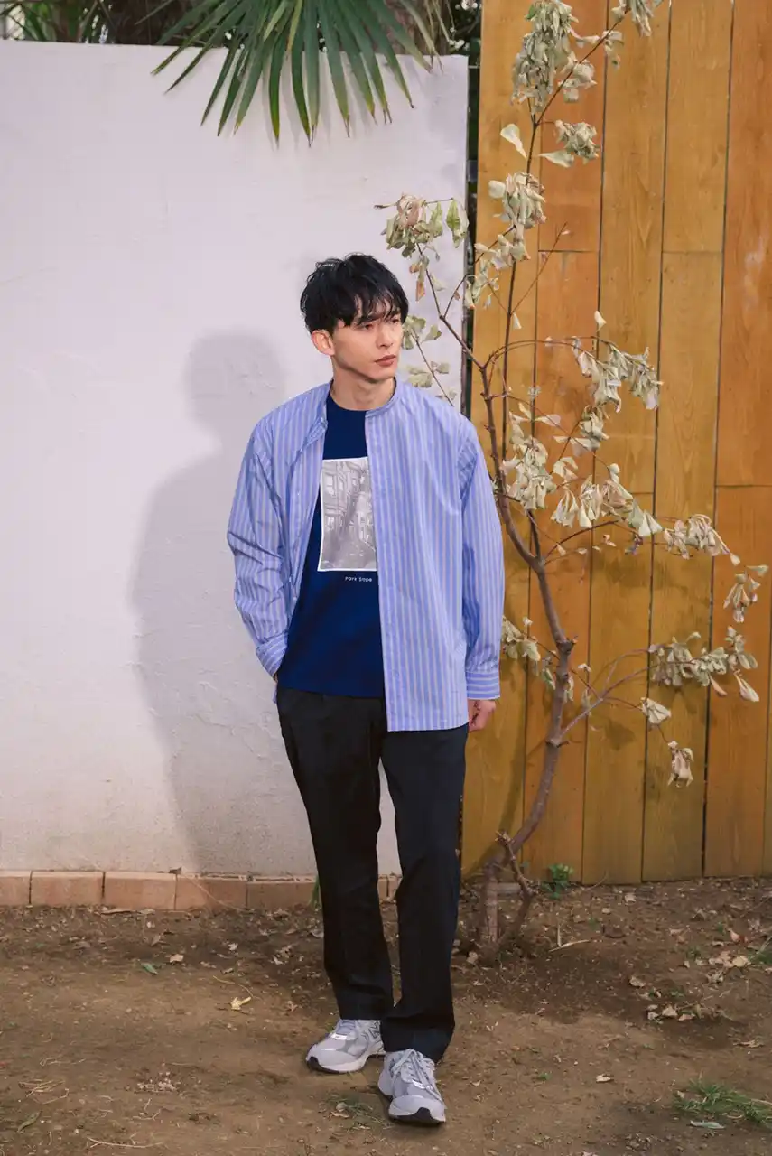 | フォトTに、ストライプシャツをラフに。シンプルなスタイルへ、さりげないアクセントを添えて。 | |||