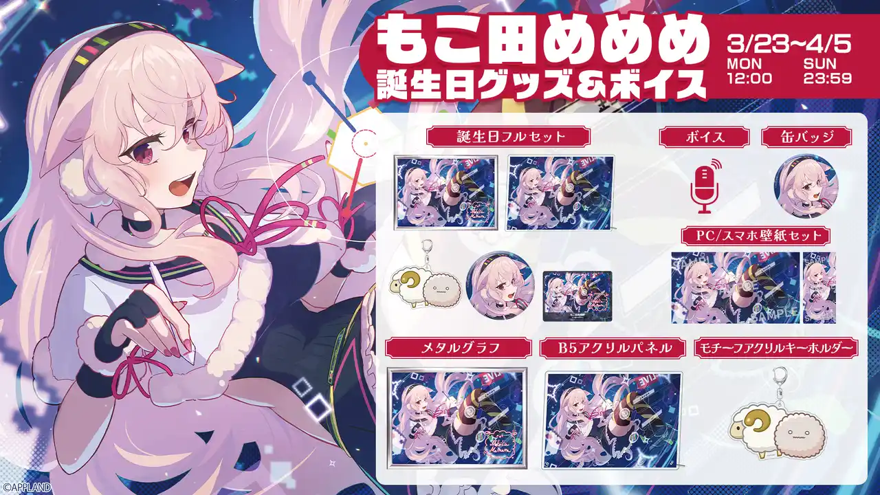 2026年3月23日(月)に誕生日を迎えるもこ田めめめを記念したグッズ&ボイスが全9種類登場!APPLAND OFFICIAL SHOP(https://4693.live/)にて同日12時から販売いたします。 |