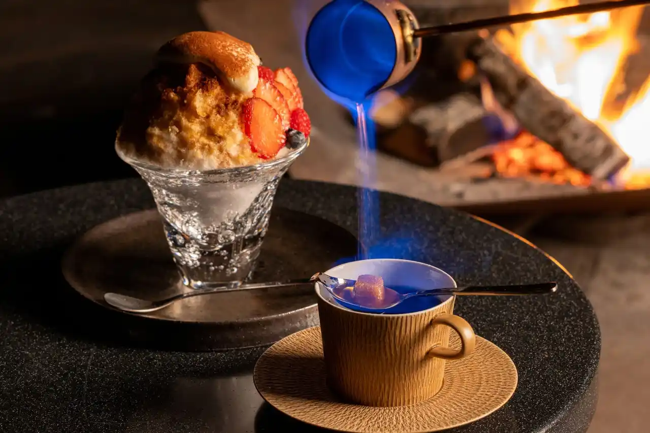 | 「夏夜の森 グランピング焼き氷」に使用するコーヒーシロップは、焚き火で熱した白州ウイスキーを注ぎ、立ち上がる炎で香りを閉じ込めるフランベで仕上げます。カフェ・ロワイヤルに着想を得た演出が、白州の爽やかなで繊細な香りを引き立てます。 ブルーベリーと夏苺の酸味に、エスプレッソのほろ苦さとウイスキーの重厚な余韻が重なり、氷が溶けるごとに深まる味わいの移ろいまで堪能できる、格別な大人の一品です。 | |||