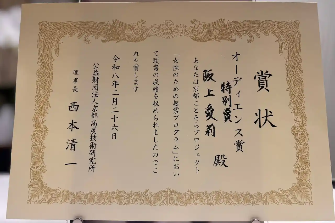 阪上は、「第14回京都女性起業家賞(アントレプレナー賞)」において、トーマツ京都事務所賞および日本政策金融公庫賞をダブル受賞いたしました。 |