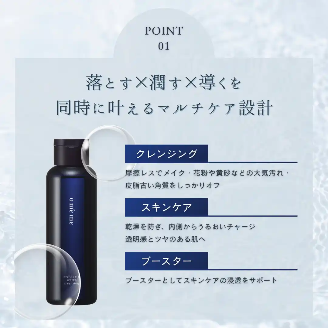 「取り去る」ケアだけでなく、うるおいを「与える」ケアも同時に叶える──それがomeme multi care water cleansingの特徴です。 |