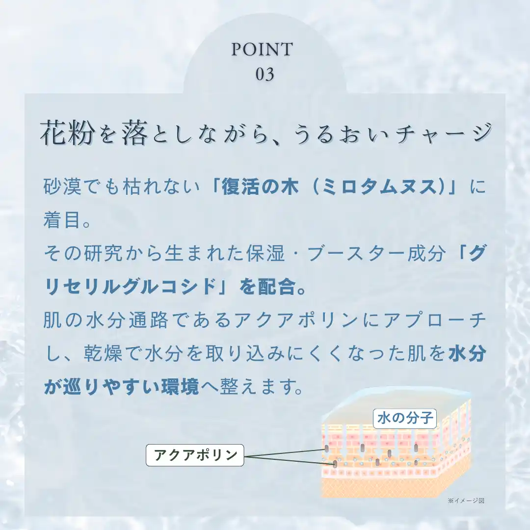 帰宅後すぐに花粉・メイク汚れ・皮脂・古い角質をしっかりオフしながら、落とした後もしっとり。次のスキンケアの浸透をサポートし、うるおいを肌へ届けます。 |