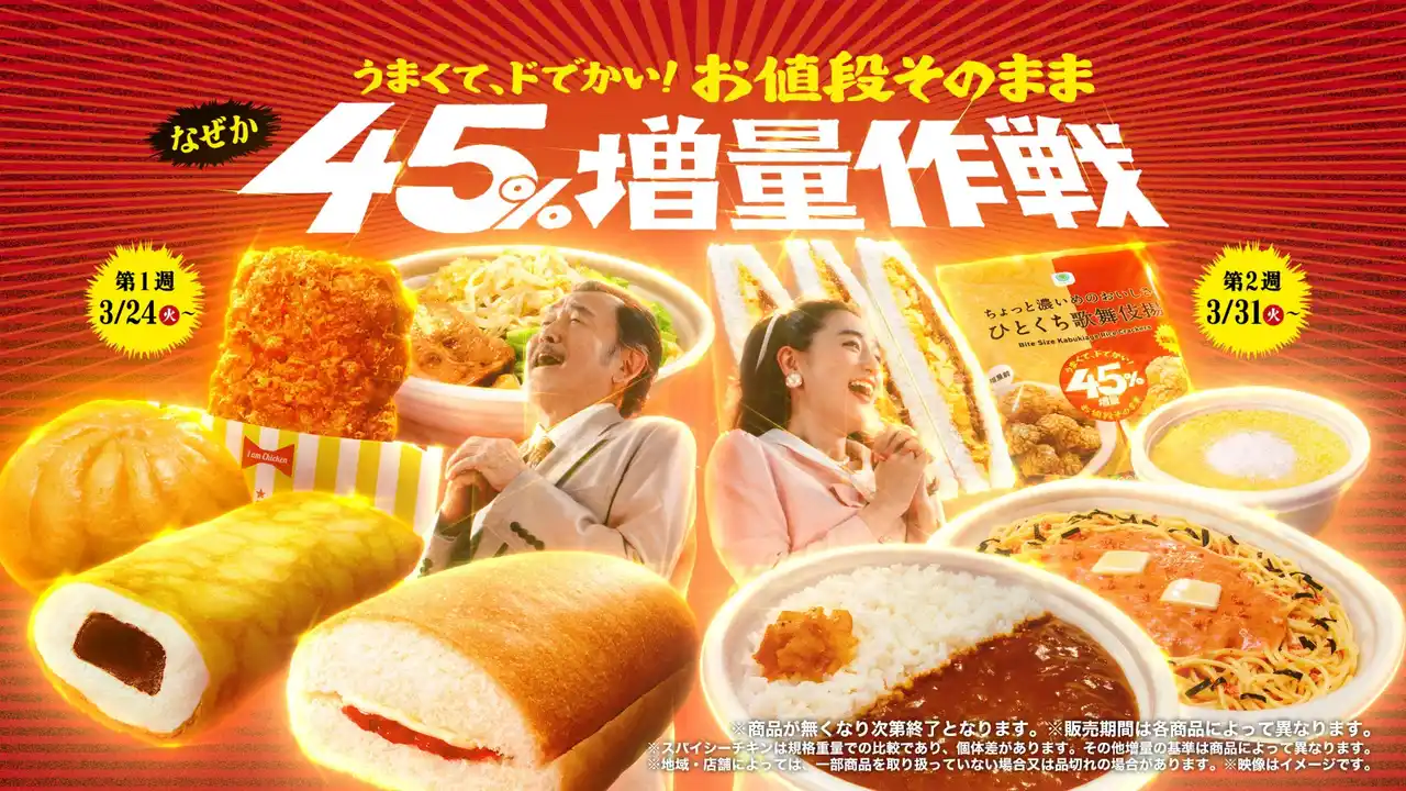 今年は創立45周年を記念して、「なぜか45%増量作戦」として初登場商品を含む全14種類を、週替わりで発売いたします。スパイシーチキン、パスタ、菓子、飲料に加え、春開催だからこそ実現できた温かい商品として、「ラーメン荘 歴史を刻め監修 豚ラーメン」や「コク旨ピザまん」をラインアップしました。さらに、お花見や遠足など家族や友人と分け合って楽しむシーンに着目した商品も展開します。すべてお値段そのままで、内容量を”なぜか45%”増量した、おトク感たっぷりの商品ラインアップです。 |
