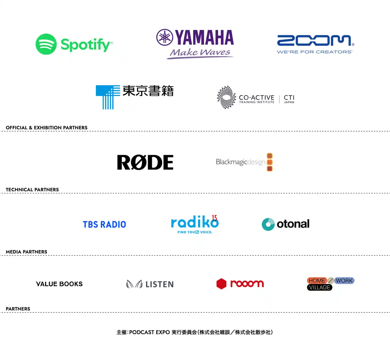 スポティファイジャパン株式会社 /ヤマハ株式会社/株式会社ズーム/東京書籍株式会社/株式会社ウエイクアップ CTI JAPAN/RØDE Microphones/Blackmagic Design/株式会社TBSラジオ/株式会社radiko/株式会社オトナル/株式会社バリューブックス/株式会社OND |