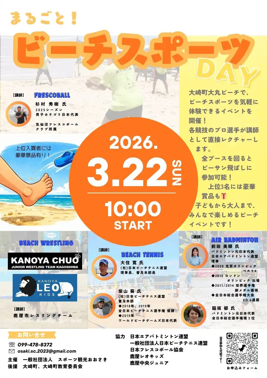 主催は、一般社団法人スポーツ観光おおさき。同団体はスポーツで大崎町を盛り上げることを目標にさまざまなスポーツイベントを開催しており、このたびのイベントが実現しました。今回は、各競技の第一線で活躍された講師が集結し、エアバドミントン・ビーチテニス・フレスコボール・ビーチレスリングを一日で体験できる“周遊型ビーチスポーツイベント”となっています。さらに、ビーサングランプリ(ビーチサンダル跳ばし)も開催!成績上位者には大崎町特産品がもらえるといいます。ぜひお気軽にお越しください。 |