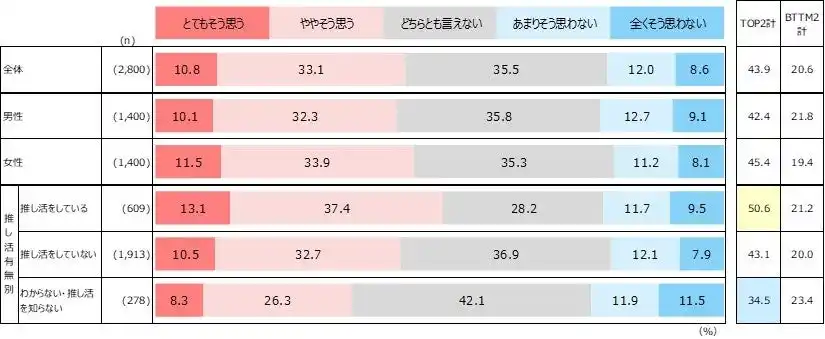 思う」と回答した割合は計43.9%となりました。また、推し活をしている人の自己肯定度50.6%は、 |
