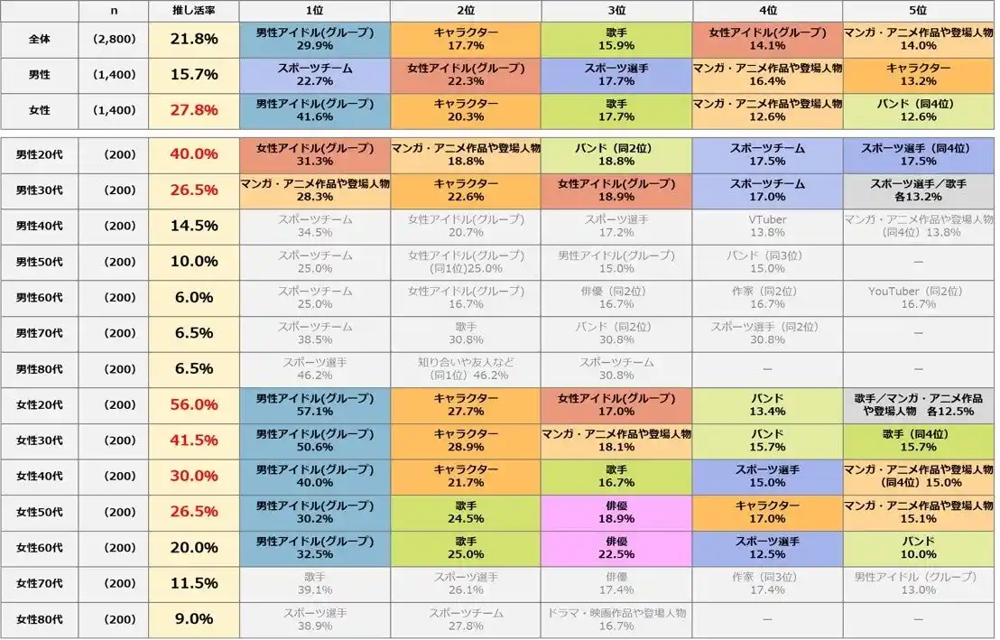 ドル(グループ)」22.3%、女性全体では「男性アイドル(グループ)」41.6%、「キャラクター」 |