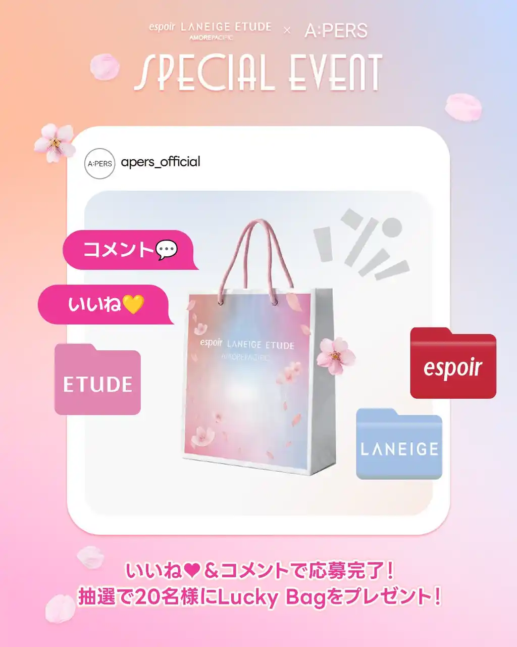 A:PERSにて、韓国化粧品業界のリーディングカンパニーであるアモーレパシフィックの人気ブランド「LANEIGE・espoir・ETUDE」の新商品や人気アイテムを体験できるPOP-UPイベントを開催いたします。 |