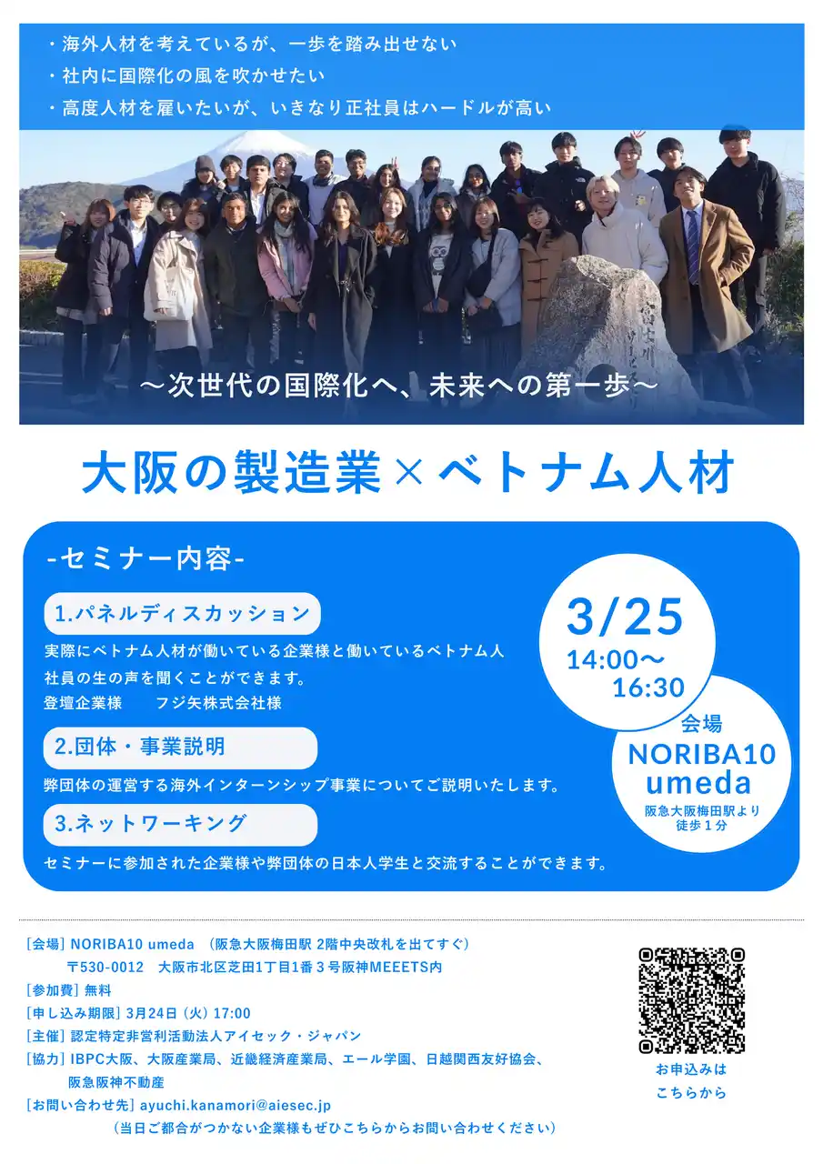 【セミナー概要】 日時:2026年3月25日(水) 14:00~16:00 申し込み締め切り:2026年3月24日(火) 17:00 実施形式:対面 参加費:無料 主催:認定特定非営利活動法人アイセック・ジャパン 協力:IBPC大阪、エール学園、大阪産業局、近畿経済産業局、日越関西友好協会、阪急阪神不動産 申し込みフォーム:こちらからお申し込みください。 【内容】 現在、ベトナムは経済・産業の両面で日本との互恵関係は深く、親日的かつ勤勉な若手人材は、日本企業の持続的な成長を支える最良のパートナーとして期待されています。特に大阪の製造業と親和性の高いベトナム人材への注目は高く、技術継承や海外展開を推進する上での更なる活躍が見込まれます。 本セミナーでは、現在ベトナム人材を活用している企業によるパネルディスカッションを通じて具体的な活用事例を提示することで、受け入れの際の不安解消となることを目指します。アイセックとの連携による低リスクかつ段階的な国際化の足掛かりとして、また参加企業様同士のネットワーク構築の場として、ぜひ本セミナーをご活用ください。 |