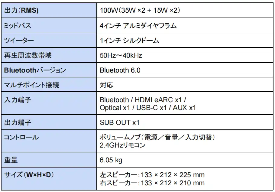 クラスDアンプ&高効率電源により、100W RMSの力強いサウンドを実現。小型筐体では再現が 難しい50Hzまでの深みある低音から緻密な高音まで、原音に忠実でより臨場感あるリスニング 体験を提供します。 |