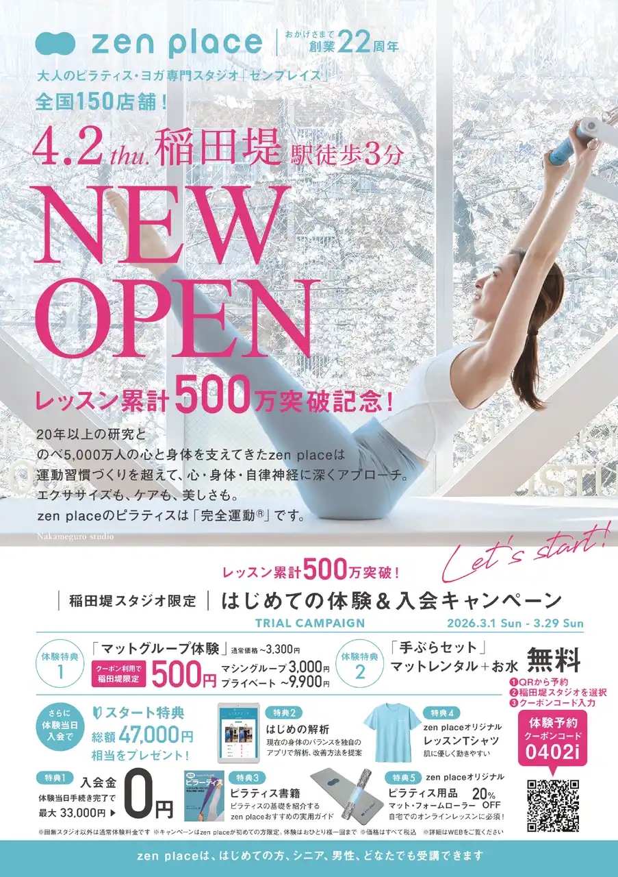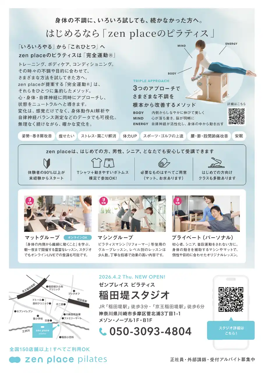 最先端研究結果・科学をもとに、グローバルな環境で最新技術とDXで挑戦を重ね、サービス業界にイノベーションを起こしている最先端のWeb3.0 DX企業であり、ウェルビーイング創造のリーディングカンパニーである株式会社ZEN PLACE(本社:東京都渋谷区 代表取締役:尾崎成彦)は、JR南武線「稲田堤駅」南口より徒歩3分の好アクセス・好立地に開放的なスペースに各種マシンを完備したピラティス専門スタジオ「zen place pilates 稲田堤スタジオ」を2026年4月2日(木)にオープンします。 |