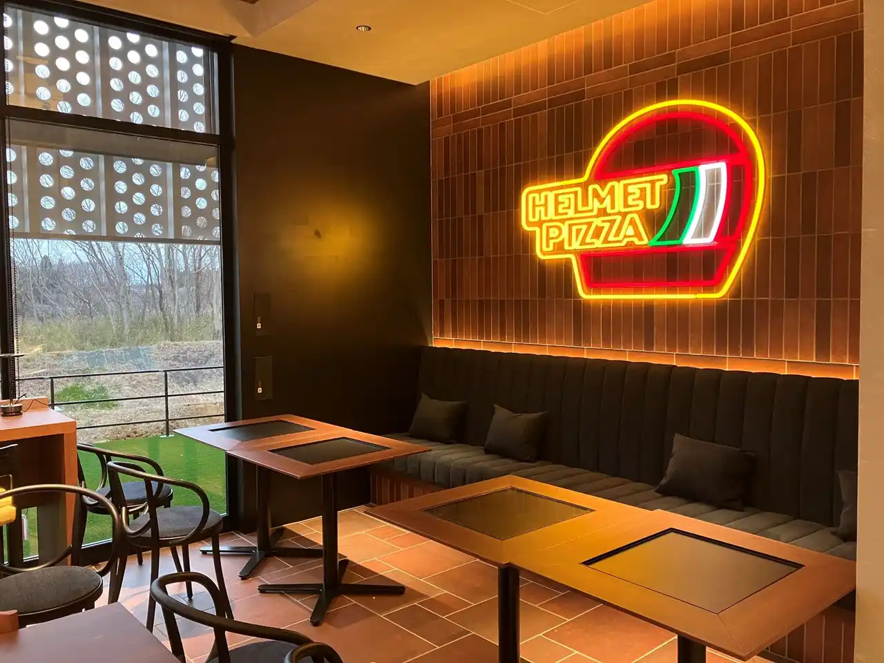 大きなピザ窯が印象的なオープンキッチン、イタリア製タイルを使用したウッディで落ち着いた雰囲気の店内は34席。壁面にはヘルメットが展示されており、お食事をしながらSHOEIの世界観を体験できます。 |