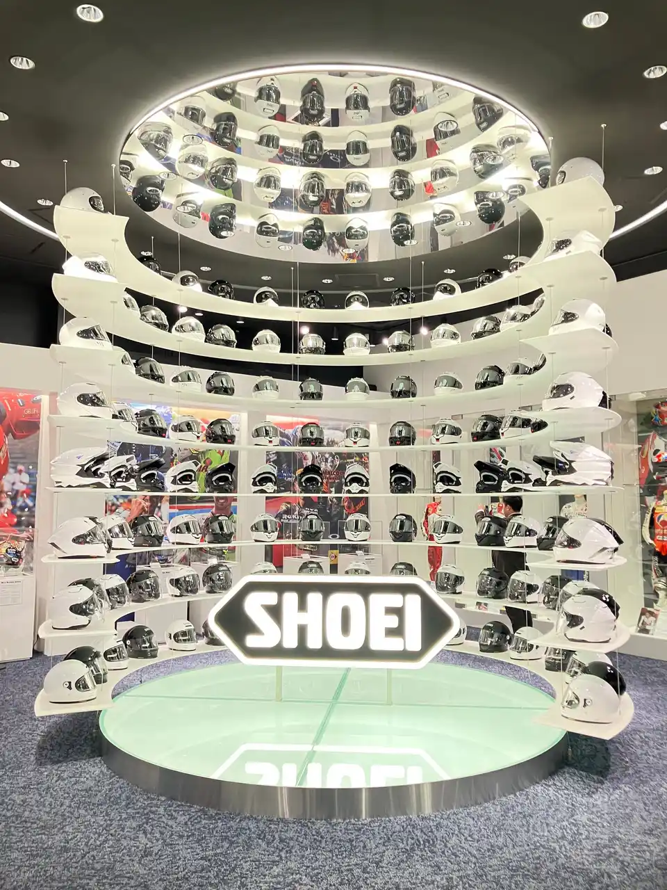 施設中央にある階段を上ったさきに現れる、SHOEIヘルメットタワーが来場者を出迎えます。 |