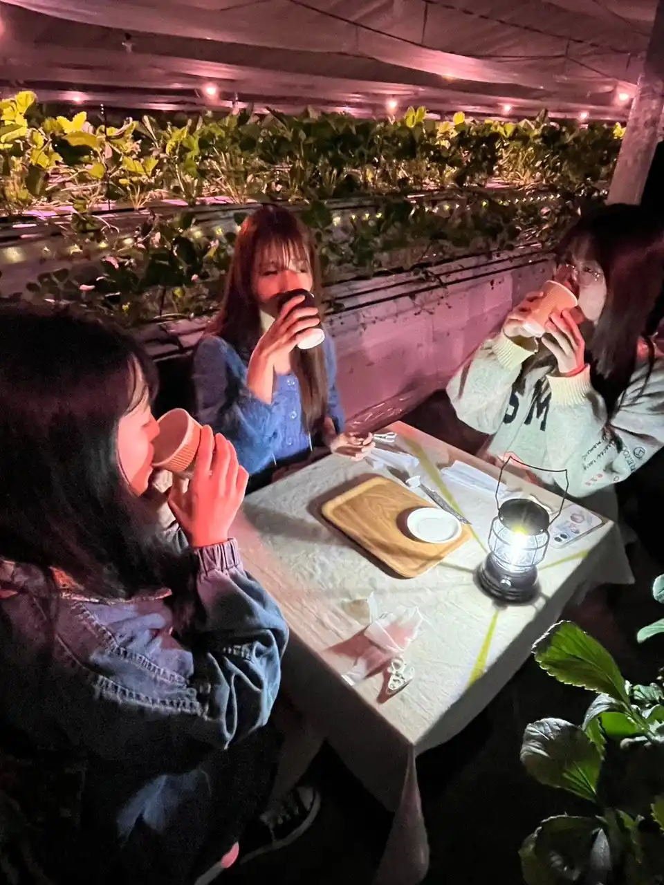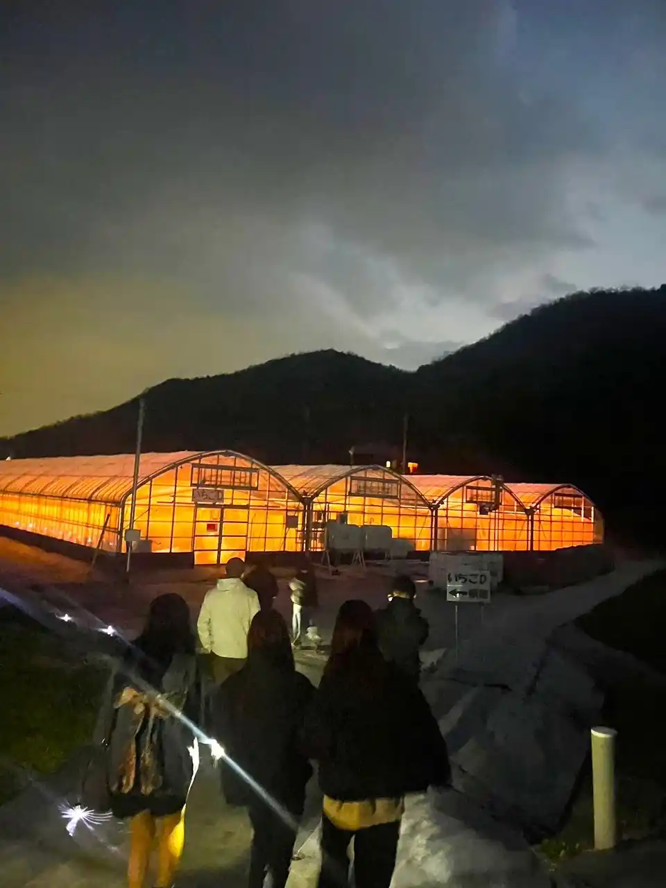 昼間のにぎやかないちご狩りとは異なり、夜の農園には落ち着いた空気が広がります。 |