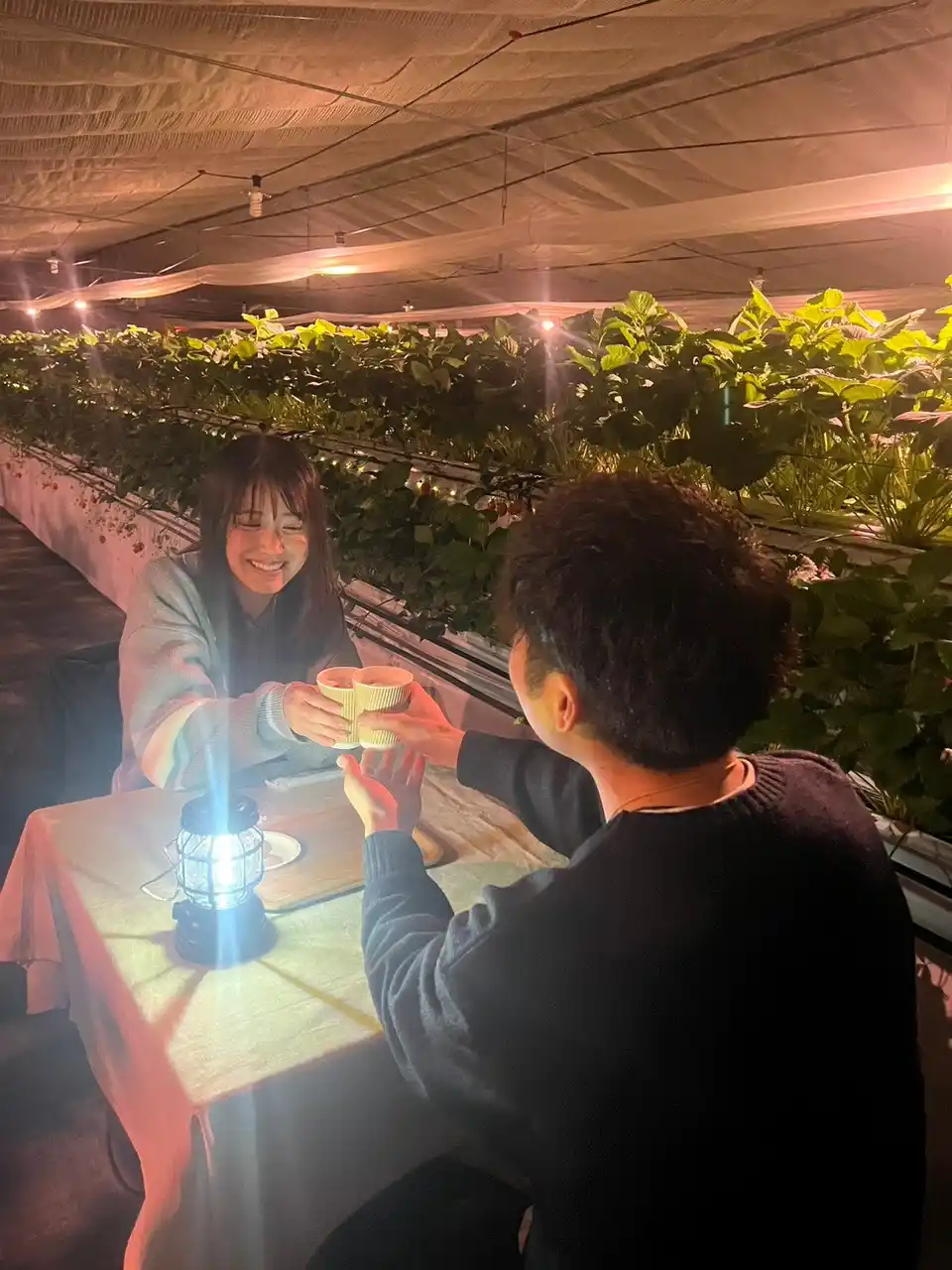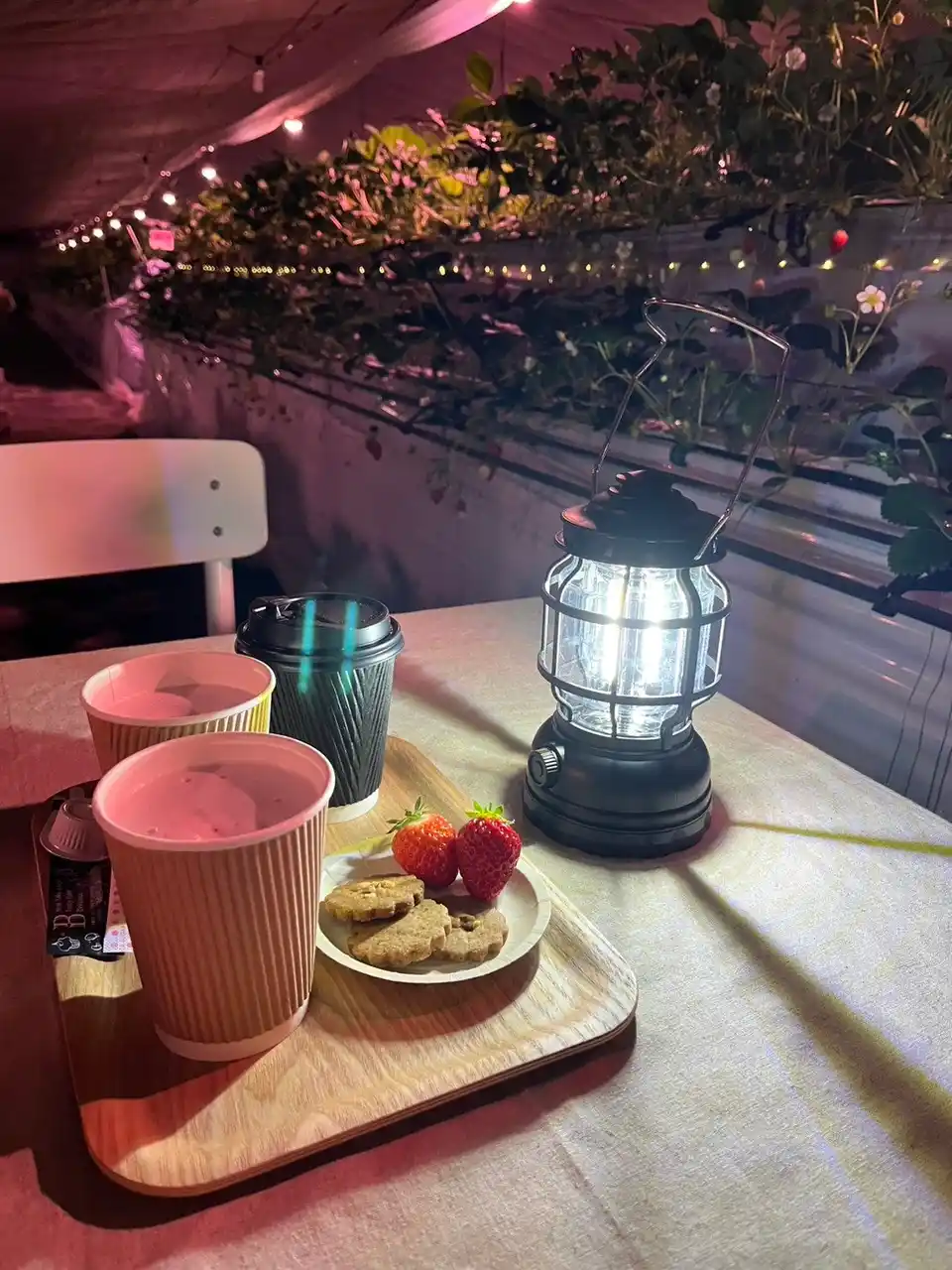 甘くジューシーないちごと温かなドリンクの組み合わせが、夜の農園時間をより特別なものに演出します。 |