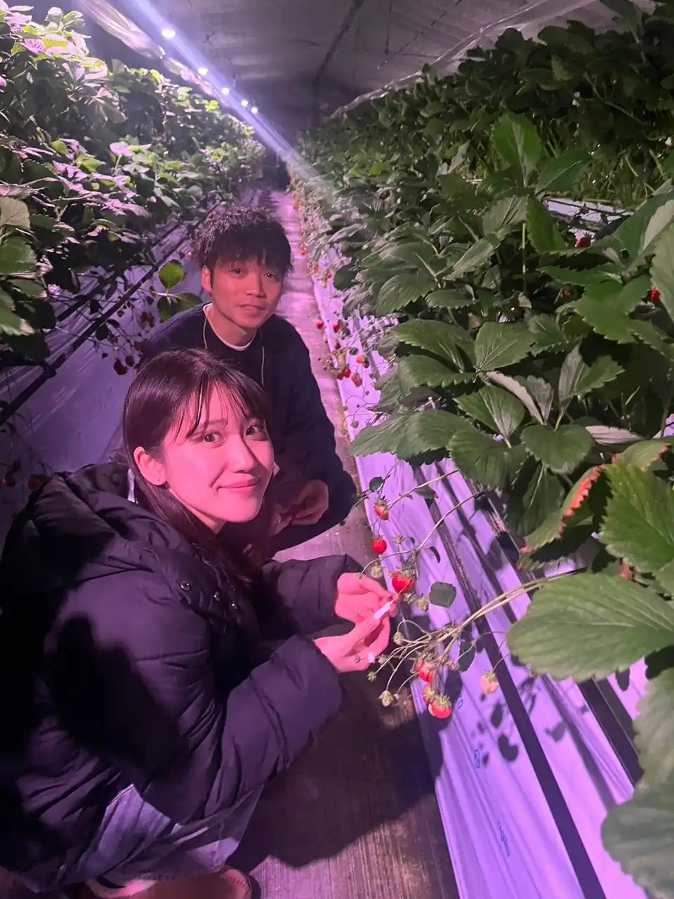 ライトに照らされた幻想的ないちごハウスで、いちご狩りをお楽しみください。 |